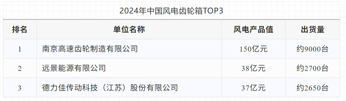 本次大会同步正式发布的2024年全球风电齿轮箱出货量排名显示,南高齿、远景能源与德力佳(603092)位列前三名。