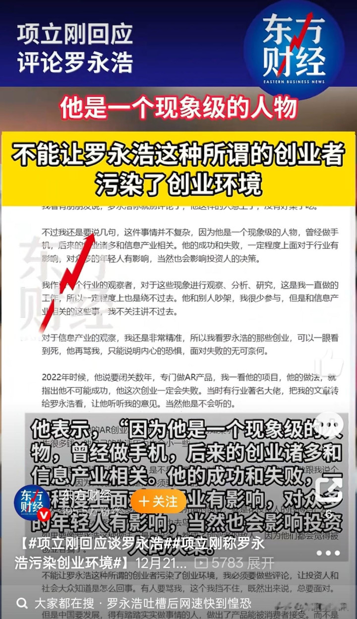 罗永浩直接转发项立刚的分析帖,骂人家智障、精神病。项立刚也不惯着,写长文回怼,说罗永浩只会骂人没逻辑,创业失败就是因为没技术没眼光,英语培训、手机、AR全是跟风扑街。紫辉创投郑刚也跟着补刀,说罗永浩花投资人的钱博自己的名声。