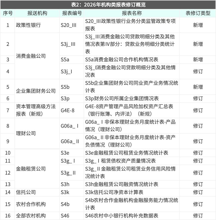 机构类报表新增4张表,修订12张表,覆盖政策性银行、消费金融公司、理财公司、金融租赁公司等多类机构,反映监管对不同业态差异化、精细化的统计要求。具体见表2:
